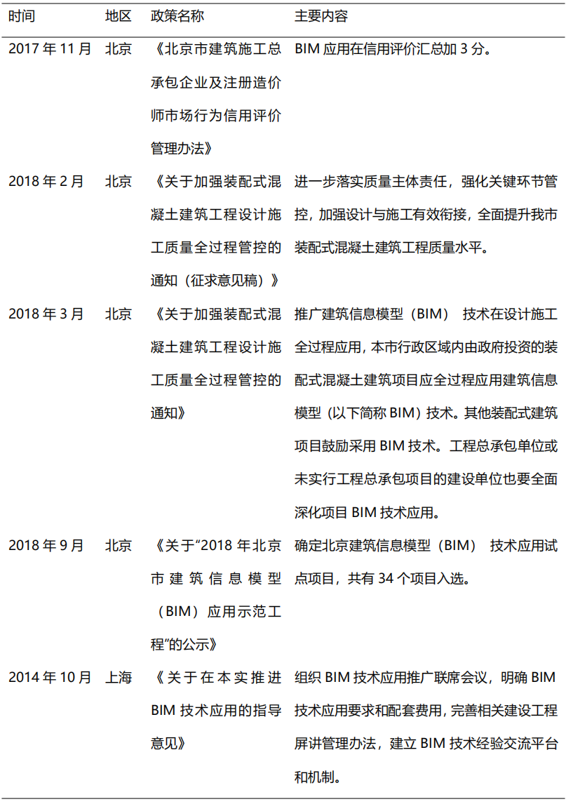 從2014年開始,在住建部的大力推動下,各省市政策相繼出臺BIM推廣應用文件,到目前我國已初步形成BIM技術應用標準和政策體系,為BIM的快速發(fā)展奠定了堅實的基礎。2017年,貴州、江西、河南等省市正式出臺BIM推廣意見,明確提出在省級范圍內提出推廣BIM技術應用。2018-2019年,各地政府對于BIM技術的重視程度不減,重慶、北京、吉林、深圳等多地政策出臺指導意見,旨在推動BIM技術進一步應用普及。隨著我國出臺BIM推廣意見的省市數量逐漸增多,全國BIM技術應用推廣的范圍更加廣泛。表2列舉了部分重要地方鼓勵政策。