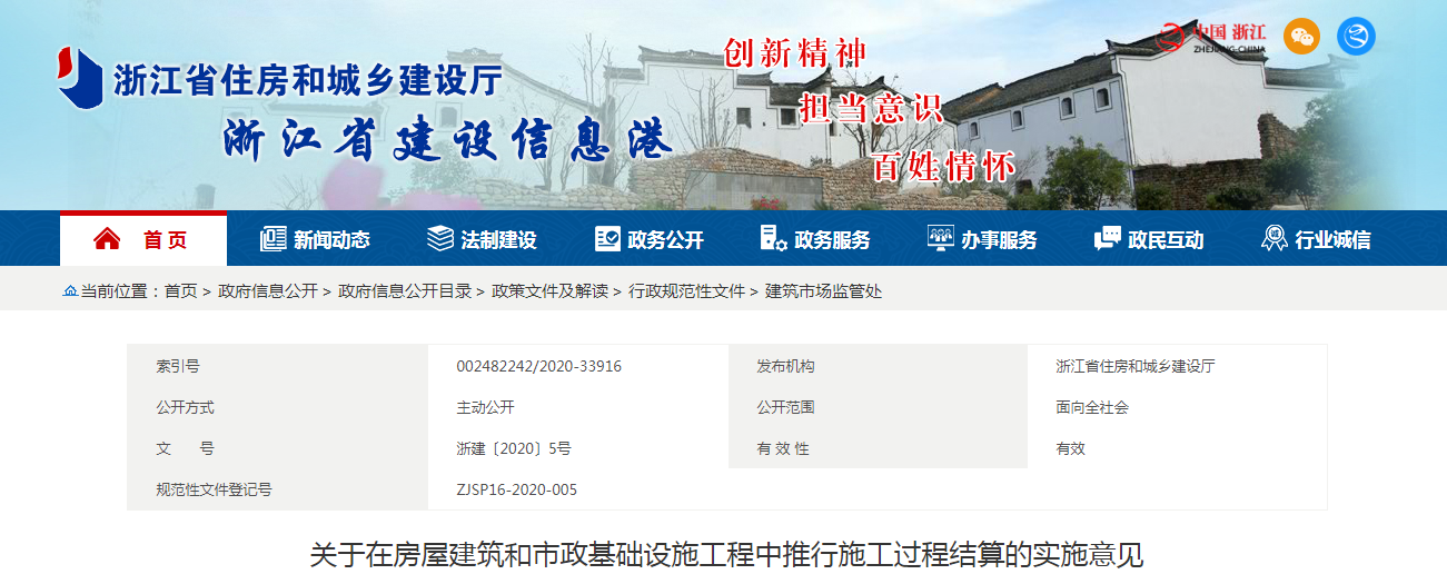 2020年5月20日,浙江省住建廳發布《關于在房屋建筑和市政基礎設施工程中推行施工過程結算的實施意見》:自6月20日起,在全省房建和市政項目中全面推行施工過程結算。