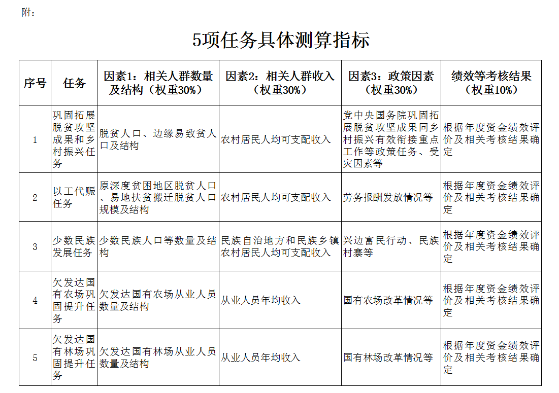 第二條 銜接資金按照鞏固拓展脫貧攻堅成果和鄉(xiāng)村振興、以工代賑、少數(shù)民族發(fā)展、欠發(fā)達國有農(nóng)場鞏固提升、欠發(fā)達國有林場鞏固提升、“三西”農(nóng)業(yè)建設(shè)任務(wù)進行分配。資金分配按照因素法進行測算,因素和權(quán)重為:相關(guān)人群數(shù)量及結(jié)構(gòu)30%、相關(guān)人群收入30%、政策因素30%、績效等考核結(jié)果10%,并進行綜合平衡。各項任務(wù)按照上述因素分別確定具體測算指標(詳見附件)。“三西”農(nóng)業(yè)建設(shè)任務(wù)按照國務(wù)院批準的規(guī)模安排。