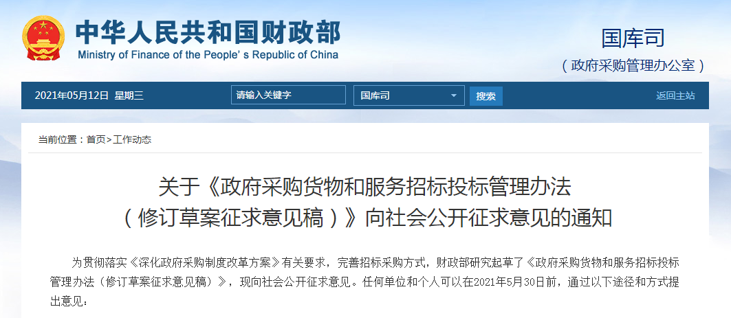 為貫徹落實(shí)《深化政府采購制度改革方案》有關(guān)要求,完善招標(biāo)采購方式,財(cái)政部研究起草了《政府采購貨物和服務(wù)招標(biāo)投標(biāo)管理辦法(修訂草案征求意見稿)》,現(xiàn)向社會(huì)公開征求意見。任何單位和個(gè)人可以在2021年5月30日前,通過以下途徑和方式提出意見: