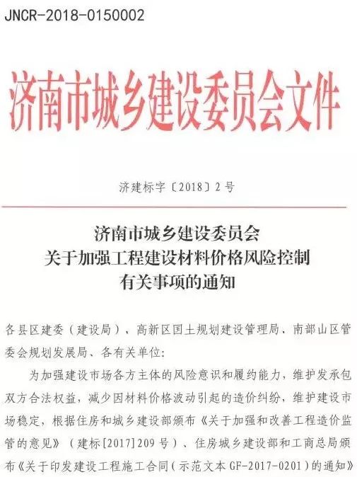 2018年1月30日,濟南市住建委印發(fā)《關(guān)于加強工程建設(shè)材料價格風(fēng)險控制有關(guān)事項的通知》(濟建標(biāo)字〔2018〕2號),明確工程計價中應(yīng)推行風(fēng)險共擔(dān)和合理分?jǐn)傇瓌t,承包人應(yīng)有限度承擔(dān)材料價格等市場風(fēng)險。