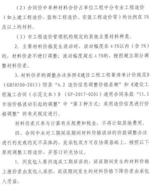 2、合同中已經(jīng)采用無限風(fēng)險、所有風(fēng)險等表述對材料價格風(fēng)險進(jìn)行明確約定的,發(fā)承包雙方可在協(xié)商基礎(chǔ)上調(diào)整工程造價,并簽訂補充協(xié)議。調(diào)整的范圍限定于主要材料。主要材料價格發(fā)生波動時,波動幅度在±5%以內(nèi)(含5%)的,材料價差不進(jìn)行調(diào)整;波動幅度超出±5%的,按照超出部分調(diào)整材料價差。