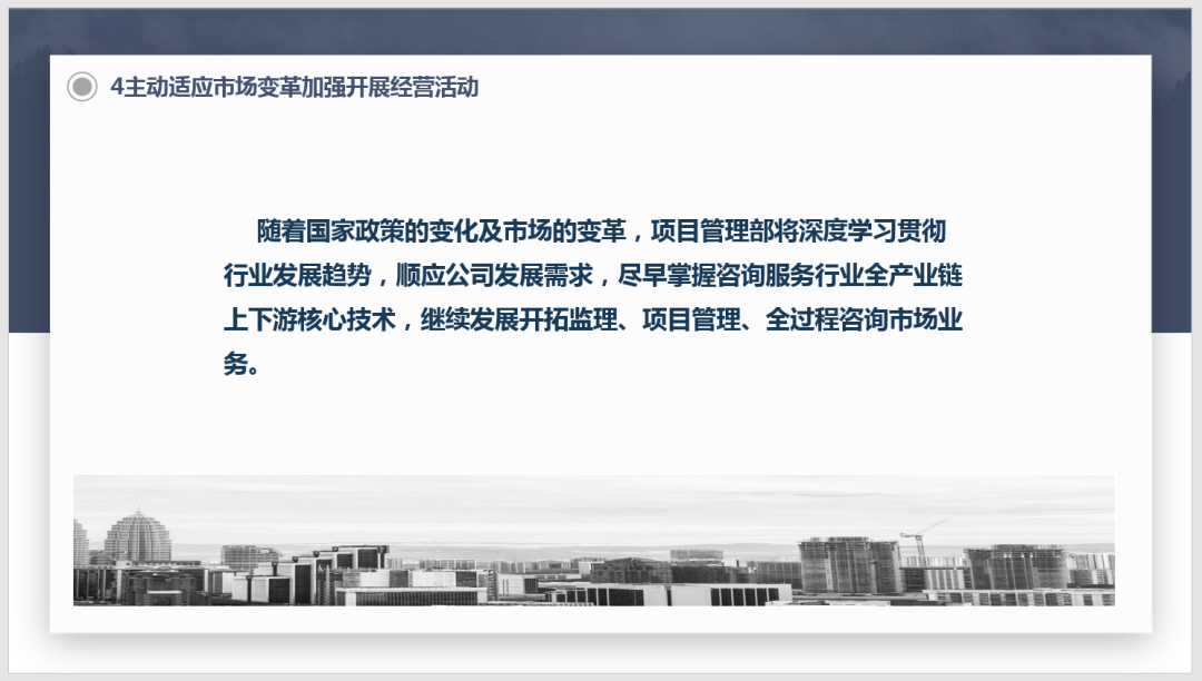 2、項(xiàng)目管理事業(yè)部:及時(shí)總結(jié)已完及在建全過程工程咨詢項(xiàng)目管理經(jīng)驗(yàn),緊跟公司發(fā)展戰(zhàn)略定位,不斷提高工程咨詢?nèi)a(chǎn)業(yè)鏈上下游核心技術(shù)水平,積極發(fā)展開拓工程監(jiān)理、項(xiàng)目管理、全過程工程咨詢業(yè)務(wù)。