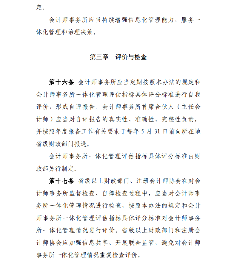 為貫徹落實(shí)《國(guó)務(wù)院辦公廳關(guān)于進(jìn)一步規(guī)范財(cái)務(wù)審計(jì)秩序促進(jìn)注冊(cè)會(huì)計(jì)師行業(yè)健康發(fā)展的意見(jiàn)》(國(guó)辦發(fā)〔2021〕30號(hào))有關(guān)要求,加強(qiáng)會(huì)計(jì)師事務(wù)所內(nèi)部治理,提高質(zhì)量管理水平,根據(jù)《中華人民共和國(guó)注冊(cè)會(huì)計(jì)師法》、《會(huì)計(jì)師事務(wù)所執(zhí)業(yè)許可和監(jiān)督管理辦法》(財(cái)政部令第97號(hào)文件修改發(fā)布),我們制定了《會(huì)計(jì)師事務(wù)所一體化管理辦法》,現(xiàn)予印發(fā),自2022年10月1日起執(zhí)行。