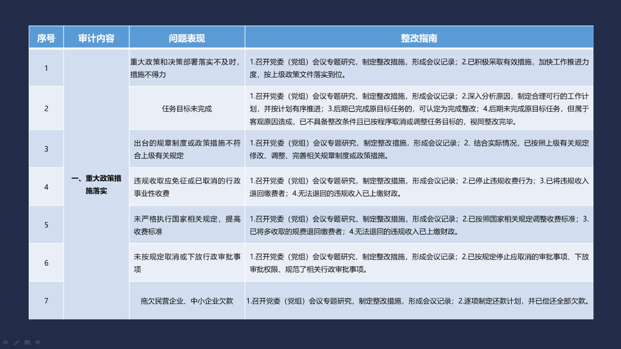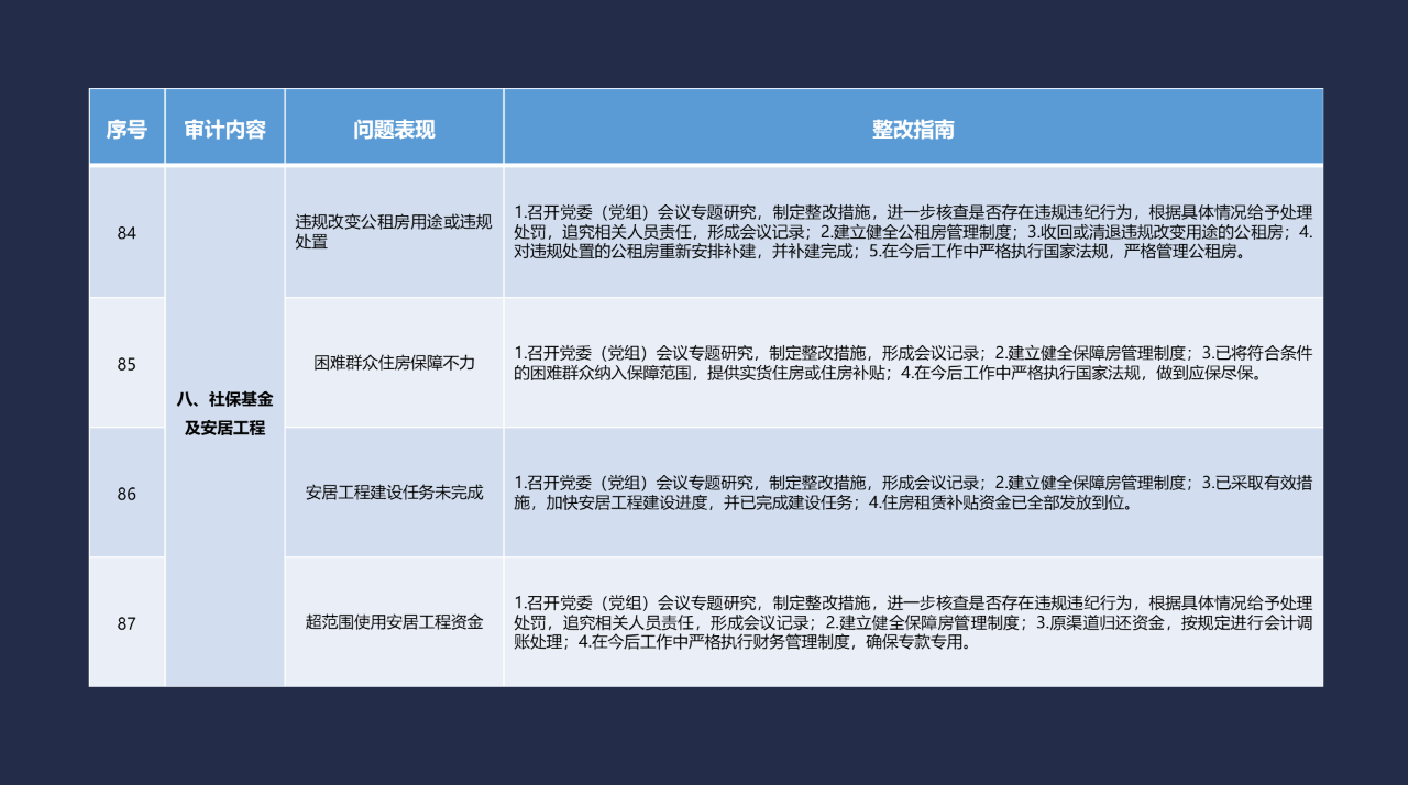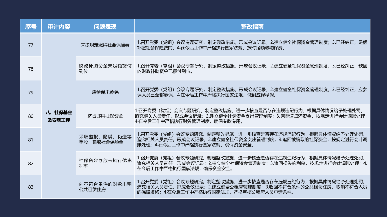 《整改指南100條》僅對審計整改的認定提供一般參考,每個問題的具體整改要求由審計機關在此基礎上依據審計事實、問題情節、產生后果,在審計報告及所附的《審計發現問題清單》中予以明確。涉及上級審計查出問題的整改情況按照上級審計機關有關要求進行落實。