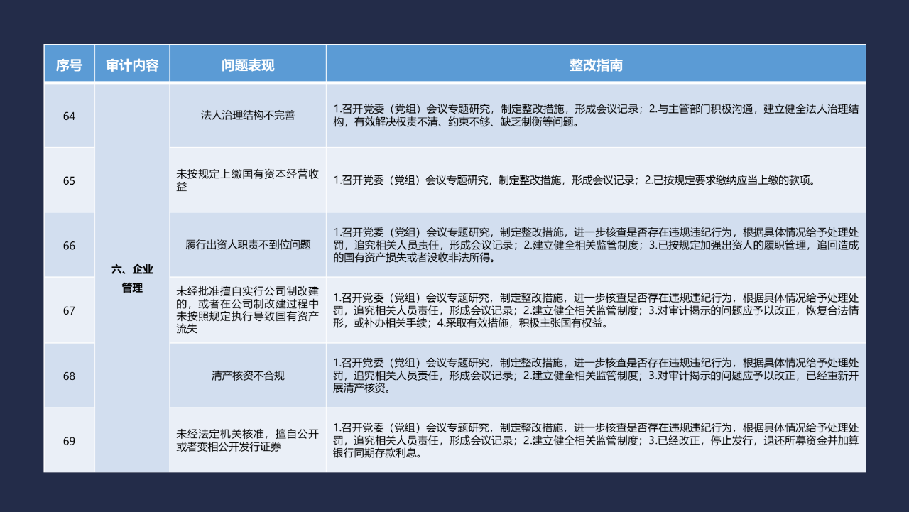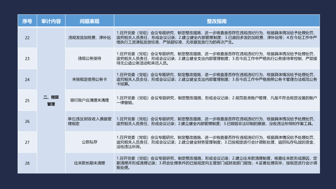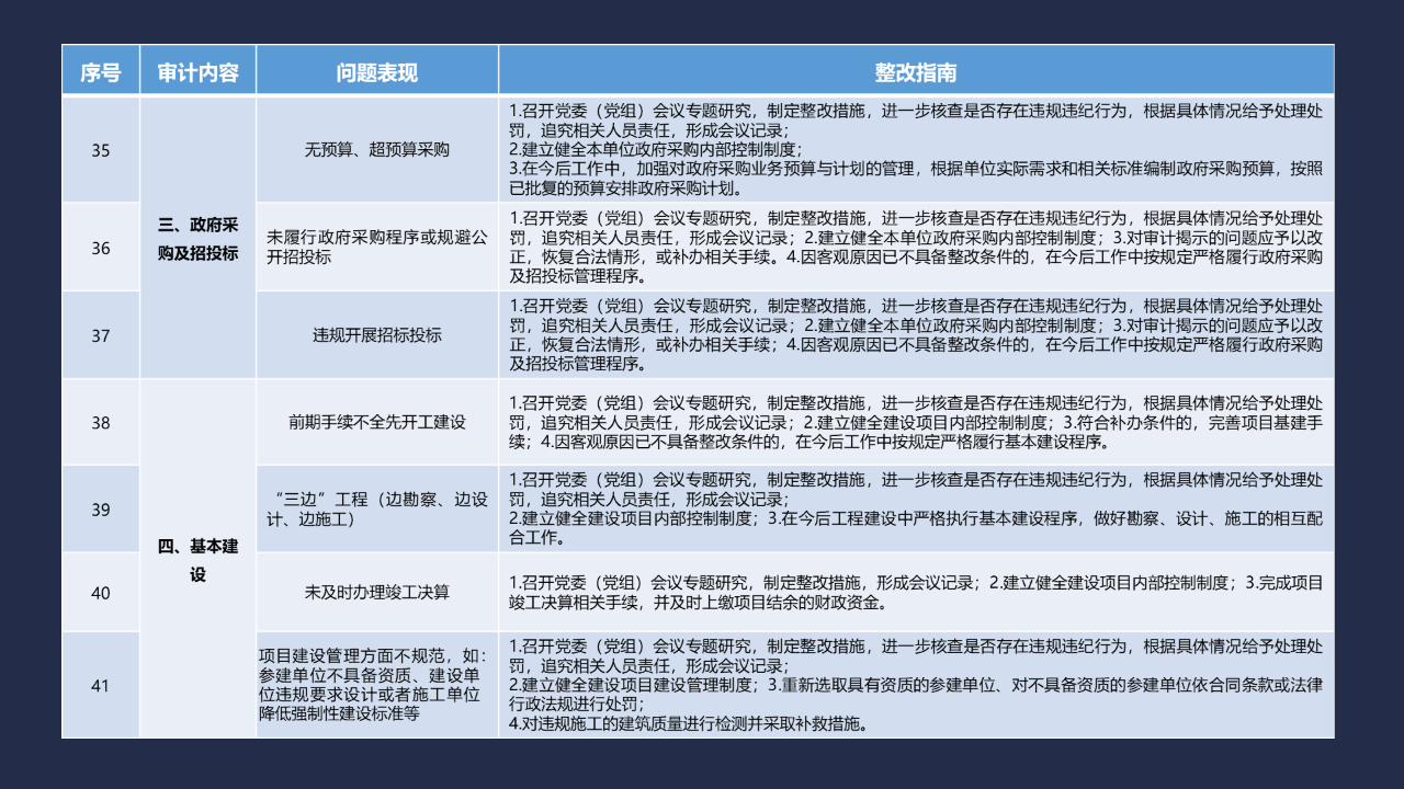 《整改指南100條》是在《江西省審計廳審計整改督查工作暫行辦法》(贛審綜發〔2021〕4號)第四章“審計整改認定標準”有關規定的基礎上,結合審計整改工作實際,對常見審計查出問題的整改結果認定標準進行明確和細化。《整改指南100條》按照常見的重大政策措施落實、預算管理、政府采購及招投標、基本建設、內控管理、企業管理、自然資源、社保資金及安居工程、金融管理、國外貸援款共10類審計內容進行問題分類,列舉了100個常見問題并給出相對應的整改標準說明,重點突出落實被審計單位整改主體責任、建立健全規章制度、推動問題全面整改等方面的內容,審計機關和整改責任單位可以在審計整改工作中參照落實。