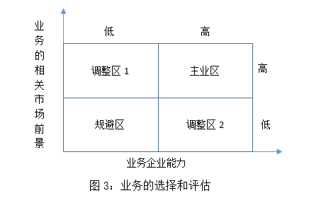 在調(diào)整區(qū)2中,城投公司在該業(yè)務(wù)上能力較強(qiáng),但潛在的市場(chǎng)空間卻有限,公司也應(yīng)當(dāng)做出調(diào)整;如果集中資源能夠搶占競(jìng)爭(zhēng)對(duì)手的市場(chǎng),則應(yīng)積極進(jìn)入該業(yè)務(wù)領(lǐng)域,否則看這種能力是否能夠轉(zhuǎn)移,如果不能轉(zhuǎn)移,在盈利的情況下繼續(xù)經(jīng)營(yíng)。