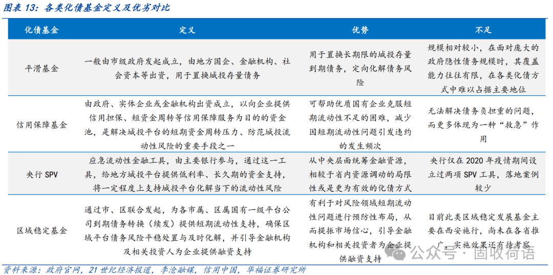 設立“化債基金”作為地方政府有效的管控城投債務風險的手段,被各地廣泛運用,包括平滑基金、信用保障基金、央行SPV等?;鹳Y金主要來源于省內/市內,調動的是區域內的金融資源,但規模相對有限;SPV在投放貸款的同時或要求抵押品,因此國有資源更為豐富的區域預計將獲得更大的支持。