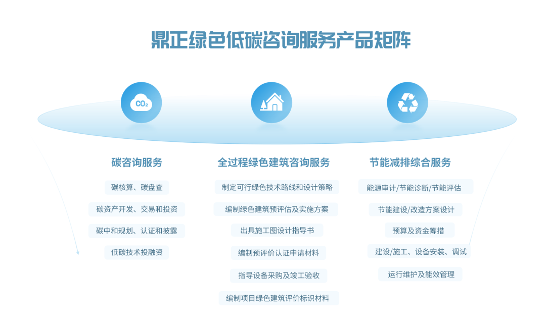 鼎故革新,正己守道。作為一家以創新驅動變革的工程咨詢企業,我們密切關注國家前沿動態,緊跟國家政策,不斷優化產品結構和服務模式。在“雙碳”目標下,自2020起即針對工程領域的降碳、減排展開探索,協助政府統籌區域能源消耗,為碳指標交易及資產管理、綠色金融、政策法規等方面的規劃作出指導,這為孵化綠色低碳咨詢產品矩陣打下堅實的基礎。