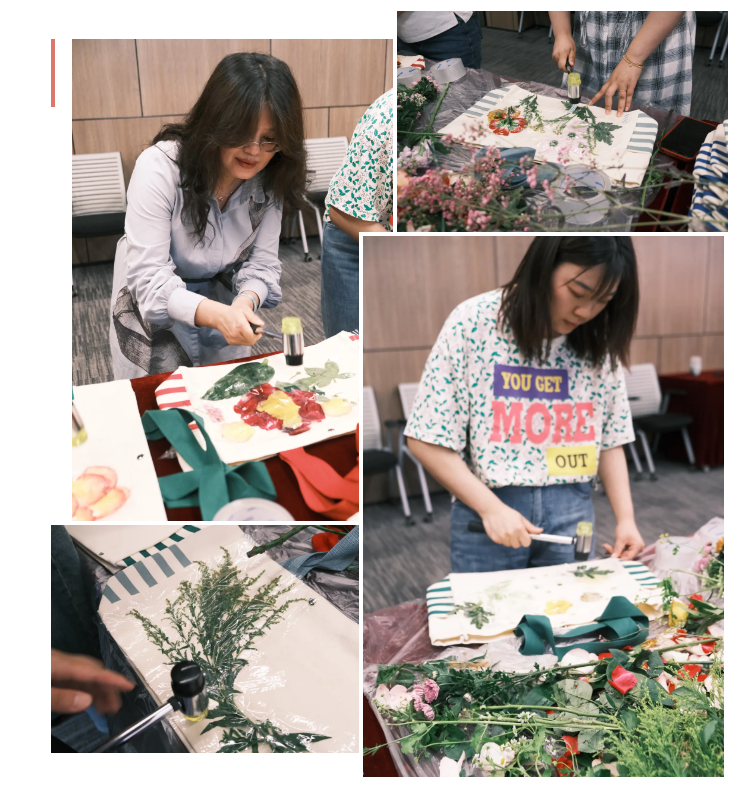 活動(dòng)現(xiàn)場(chǎng)充滿了歡聲笑語,大家紛紛使出“洪荒之力”,咚咚咚…….伴隨著細(xì)碎的敲擊聲和花草香,一幅幅色彩斑斕的植物圖案躍然紙上。