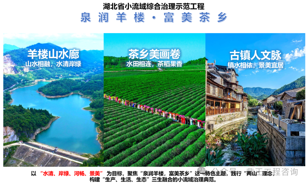 以本項目為例,設計提出以 “水清、岸綠、河暢、景美” 為目標,聚焦“泉潤羊樓,富美茶鄉”這一特色主題,踐行“兩山”理念,構建“生產、生活、生態”三生融合的小流域治理典范。