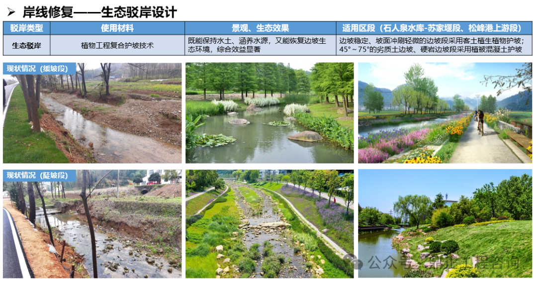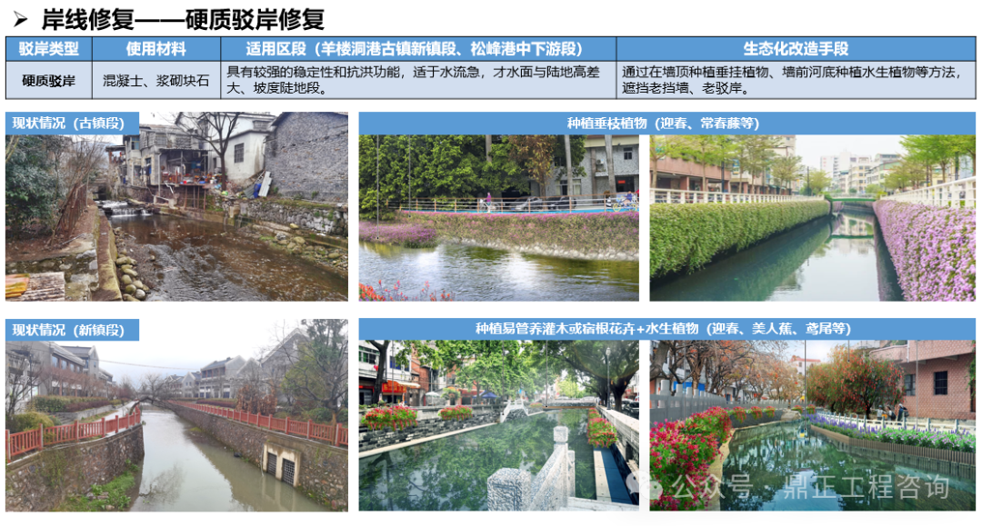 生態方面,打造“羊樓生態廊”,以水提質,修復流域生態,即實施一批駁岸整治、水質提升、生境構建等河道治理措施進行水岸共治。針對水生態的修復,根據不同水體類型提出技術方式;對于岸線的修復,又針對不同的駁岸類型提出適用的整治措施。
