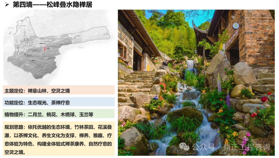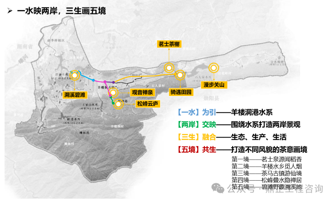 一水為引,指出治理對象,即羊樓洞港小流域;兩岸交映,指出治理范圍,即包括上下游、左右岸、堤內外;三生融合,指出治理路徑,即走好生產、生活、生態協調發展之路;五境共生,即為五個治理分區,通過分段體現差異化分區的理念,以線帶面也利于實施過程中分期分段逐步推進。每個分區都有具體的功能定位、治理目標、治理標準,因此不同分區名稱就是該區治理特色的高度凝練,既要體現水系的區位,如“茗士泉源”對應相公泉,“茶馬古鎮”對應羊樓洞古鎮,“松峰”對應松峰山;也要體現水系的形態,如“泉”、“溪”、“疊水”等;還要體現水系的功能,如“稻香”對應田園塘渠,“水鄉”對應生活河道,“碧灘”對應生態濕地等。