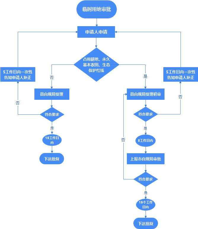 1、申請(qǐng)人向臨時(shí)用地所在地的縣(市、區(qū))自然資源主管部門(mén)提出申請(qǐng),由縣(市、區(qū))自然資源主管部門(mén)負(fù)責(zé)辦理臨時(shí)用地審批。
