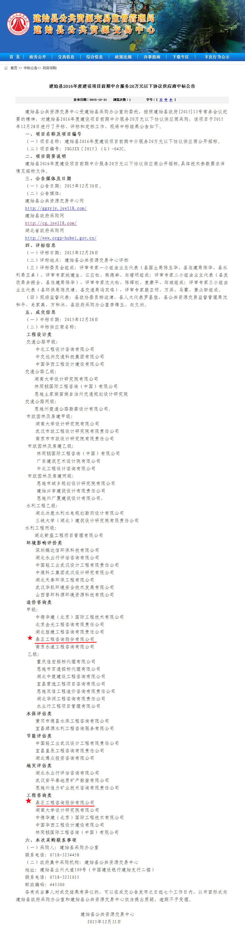 【經(jīng)營(yíng)成果】我司入選建始縣2016年度建設(shè)項(xiàng)目前期中介服務(wù)20萬(wàn)元以下協(xié)議供應(yīng)商