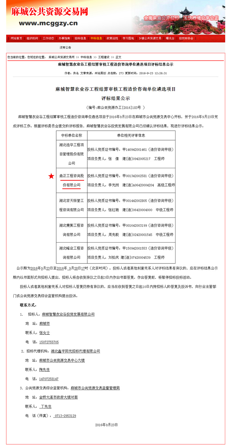 【經營成果】我司入圍麻城智慧農業谷工程結算審核工程造價咨詢單位庫