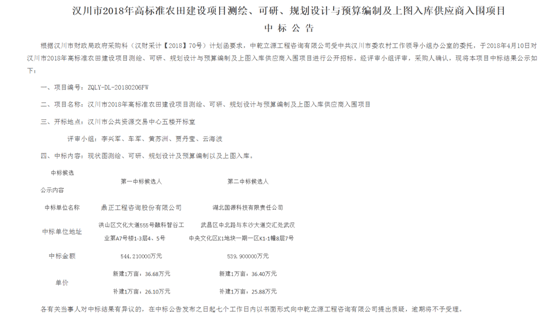 2018年4月11日,我司中標“漢川市2018年高標準農田項目”,該項目位于湖北省漢川市,項目規模約17萬畝,對漢川市2018年高標準農田建設項目進行測繪、可行性研究、規劃設計與預算編制,中標金額為544.21萬元,中標單價為新建1萬畝(36.68萬元)和補建一萬畝(26.10萬元)。
