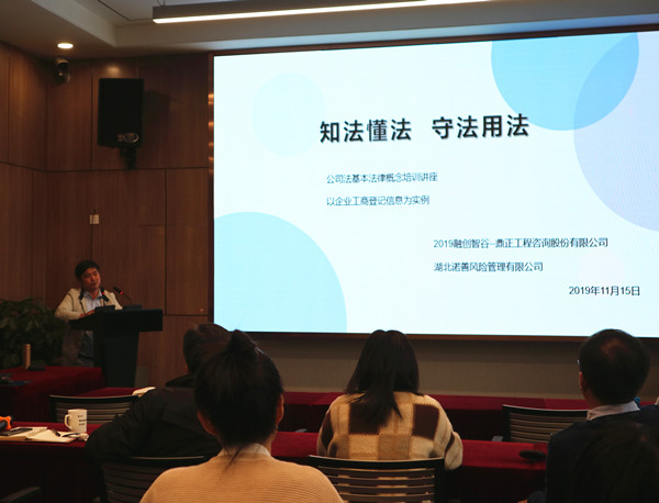 11月15日下午,我司組織開展了2019 年公司法概論與風險防控知識培訓。本次培訓邀請湖北諾善風險管理有限公司王振宇律師、馮美淵律師就《公司法》實務知識進行講解,公司董事長王雁然、副總經(jīng)理毛迎霞、技術總監(jiān)朱立冬、副總經(jīng)理姚建功等領導及各部門中層管理人員、企業(yè)發(fā)展中心、行政中心全體成員參加了本次培訓,各分公司同事遠程同步參與學習。