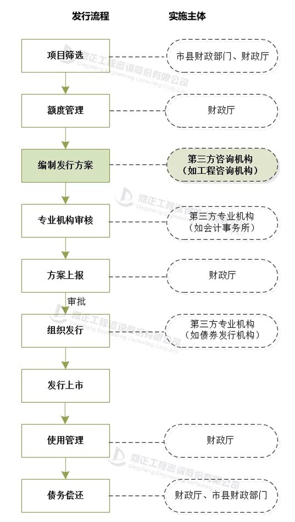 2.執行階段。由市縣級財政部門聘請咨詢機構進行方案制定、材料編寫,上報省級財政廳進行審核。土地儲備、收費公路、棚戶區改造專項債按照財政部相關管理辦法,省級財政廳在額度范圍內報國庫司組織發行。其他符合自求平衡條件的重點項目由省級政府制定實施方案及專項債管理辦法,報財政部審核通過后,向國庫司申請組織發行,通過債券市場完成發行后由省級財政廳轉貸給市縣。